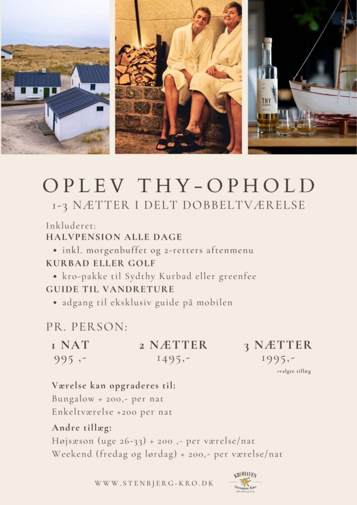 Velkommen til Stenbjerg Kro og Badehotel Oplev Thy Vesterhavsnatur og lokale råvarer på tallerkenen Kontakt os Et fristed i Thy for mad og oplevelser Kontakt os og hør mere om vores ophold Drømmer du om et ophold på hotel, kro eller bed & breakfast, er du altid velkommen til at kontakte os. Vi fortæller gerne mere og hjælper dig med at finde den løsning, der passer bedst til dine ønsker. +45 97 93 80 65 kro@stenbjerg.dk Har du spørgsmål eller ønsker du et tilbud? Kontakt os allerede i dag for mere information om hvad vi kan tilbyde dig